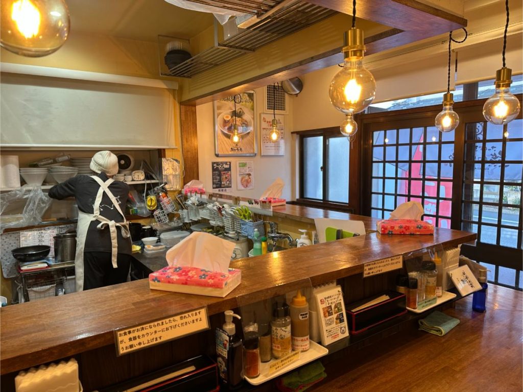 店内に入ると、まず目に入るのはカウンター席のみのシンプルな構成です。テーブル席はなく、厨房と客席の距離が近いため、調理の音や香りがダイレクトに伝わってきます。ラーメン店らしい活気がありながらも、どこか落ち着いた雰囲気が漂っているのが印象的です。カウンター越しに丁寧な調理風景を眺められるため、ラーメンが提供されるまでの時間も楽しめます。常連客が多い様子で、地元に根付いた人気店であることが伝わってきます。