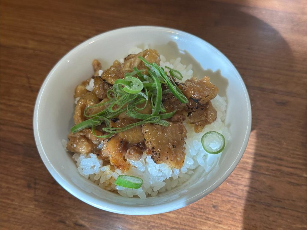 今回いただいたランチご飯は炙り鶏皮ご飯で、ラーメンのスープと非常に相性がよく、単体で食べても、スープを少しかけて「ミニ雑炊風」にしても楽しめる内容でした。